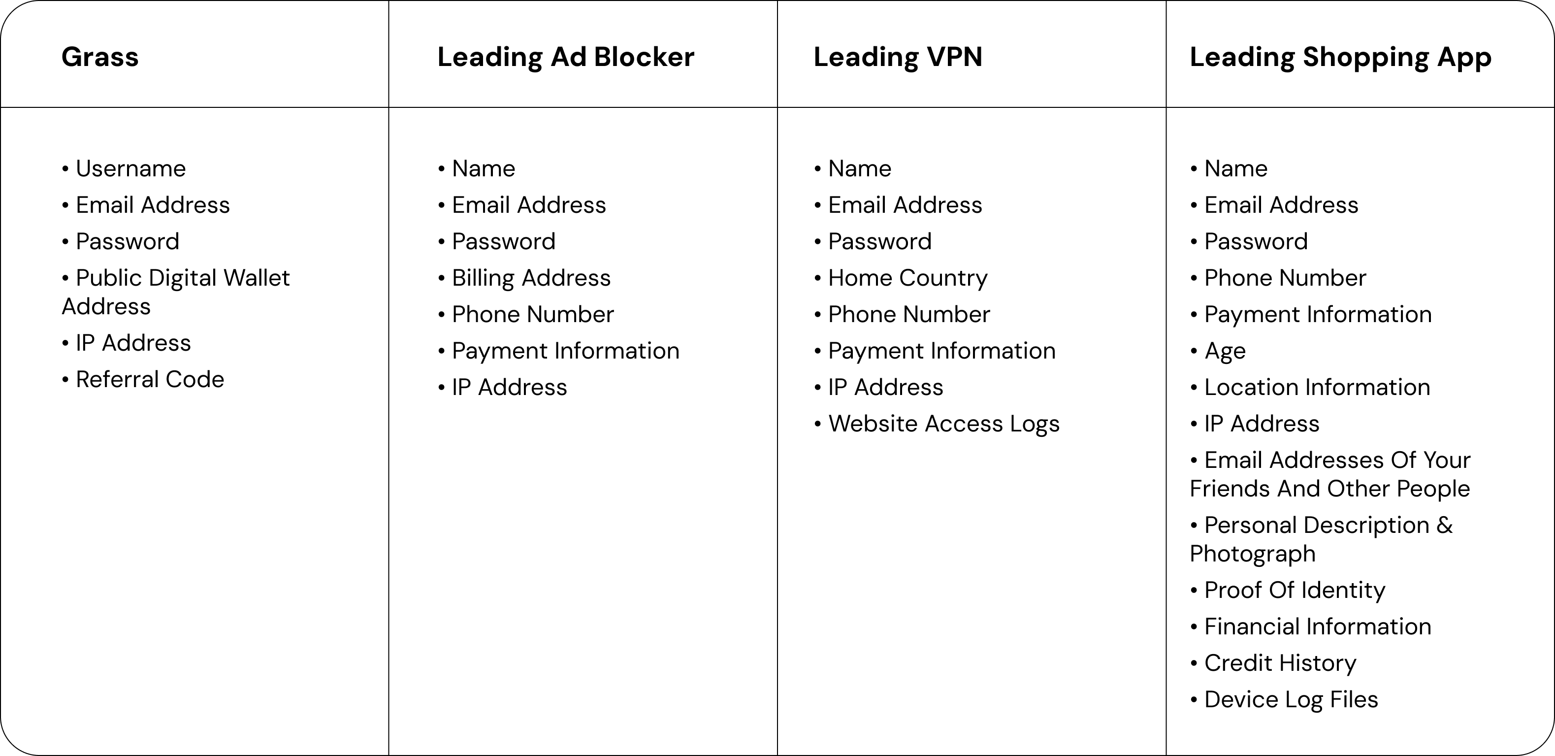 Privacy at Grass starts with requesting only the personal information necessary to operate the network, products, and services. We only ask for your: