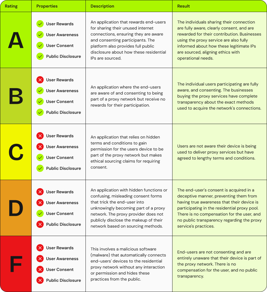 - Sourcing Method Disclosures: Proxy providers should have to publicly classify their networks based on how they get their IPs. Think about it like this: when you buy a new appliance, it has an energy efficiency rating, right? Or when you pick up food at the grocery store, there's a nutrition label and a list of ingredients. You can see what you're getting. These ratings should be public so that businesses can easily choose providers who meet high ethical standards.